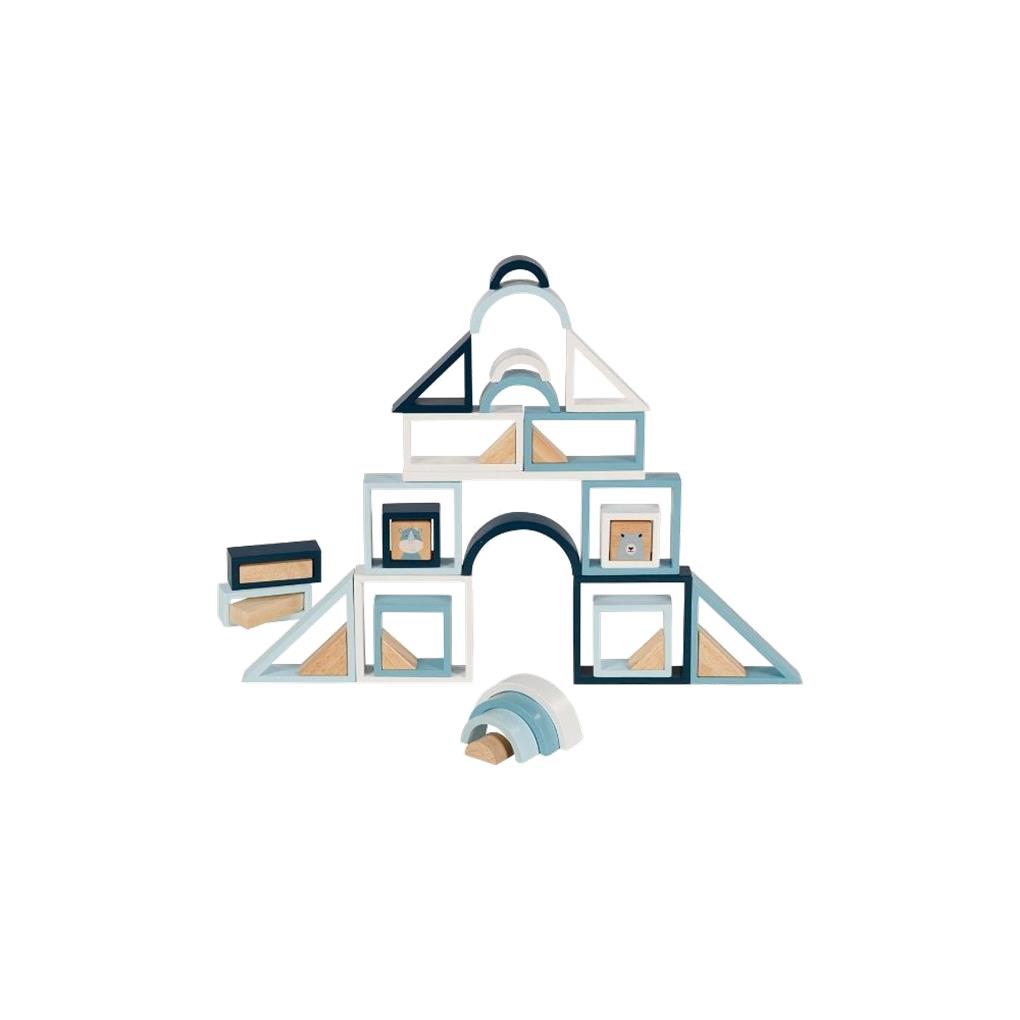 Bloques de construcción de madera que fomentan el reconocimiento de los colores y formas y favorecen el desarrollo de la motricidad fina y la capacidad de resolver problemas. Fomentan la creatividad y el juego libre e imaginativo.