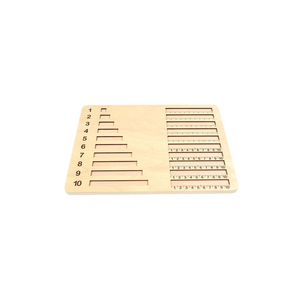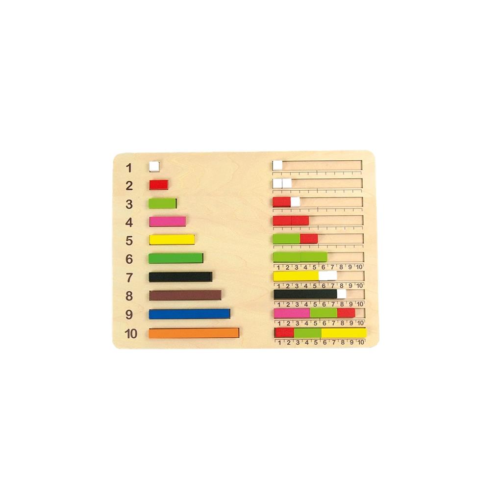 Dos tableros de madera con grabados, para colocar y sujetar las regletas durante el juego y así practicar conceptos básicos de matemáticas y múltiples ejercicios. Los tableros se han diseñado para que no se muevan las piezas durante la manipulación por parte de los niños. No incluye: tizas, borrador ni regletas.