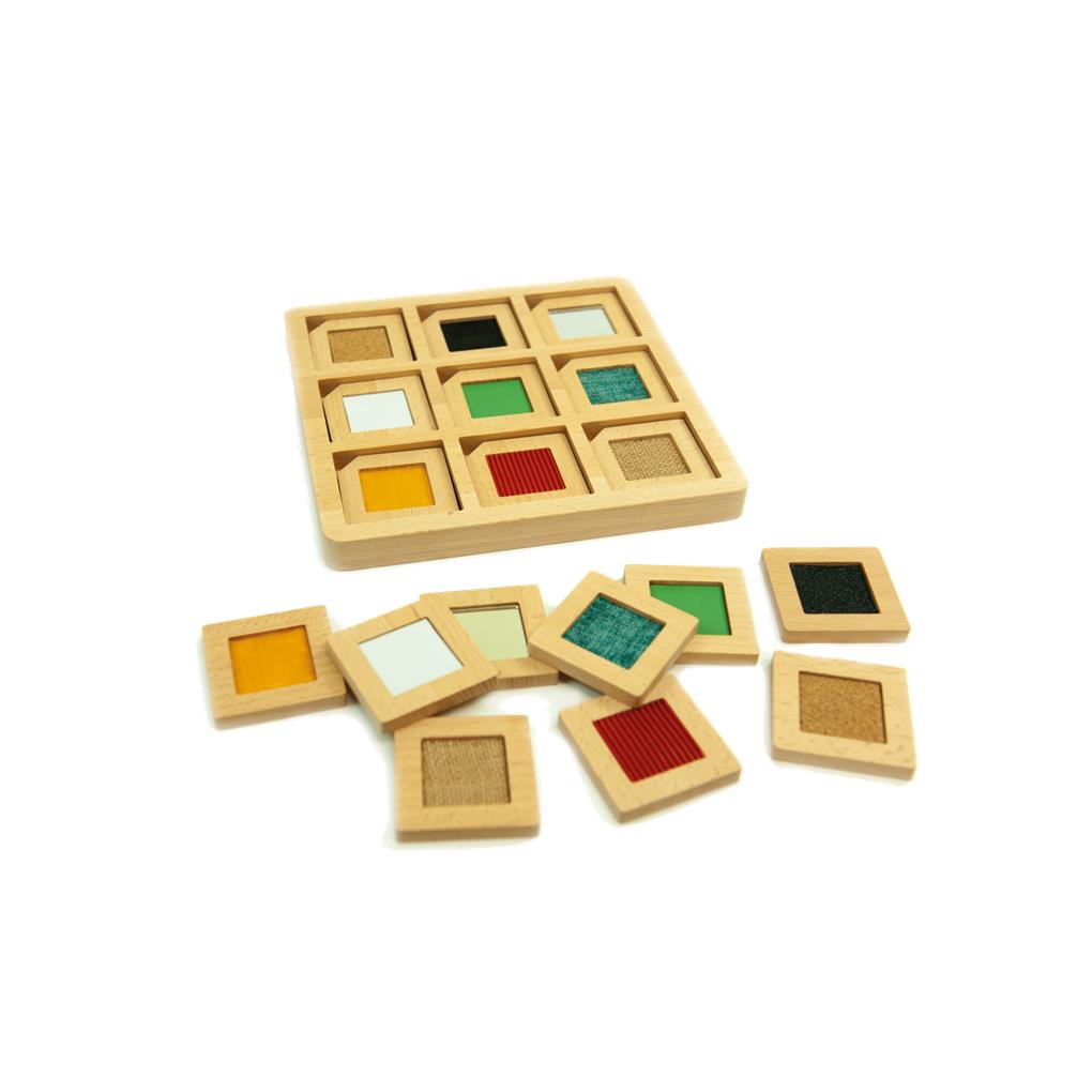 uego de memoria sensorial. Usa el tablero para colocar, según el orden que prefieras, las 9 piezas con diferentes texturas sensoriales. A continuación, fuera del tablero, dale la vuelta o coloca boca abajo, las otras nueve piezas con texturas sensoriales y que son gemelas. Una de las propuestas de juego es: emparejar en el tablero, las diferentes piezas mediante la estimulación sensorial, sin referencia visual. Descarga las instrucciones escaneando el código QR, para descubrir más opciones de juego.