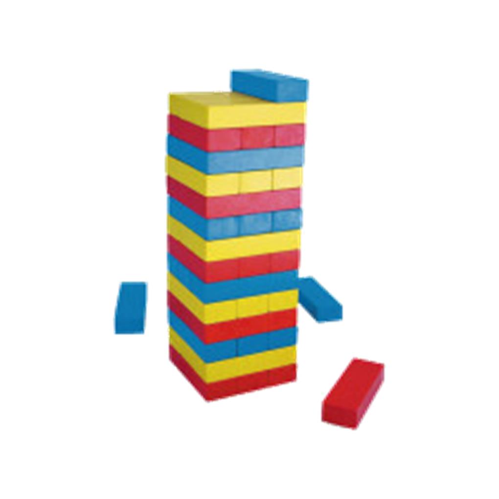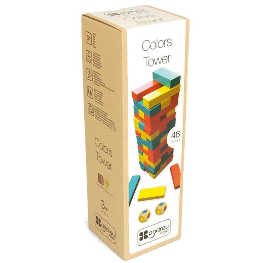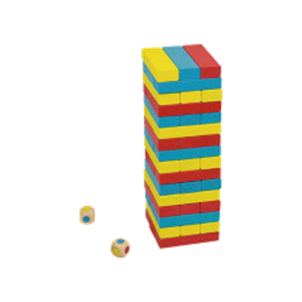 Construye la torre mezclando las piezas de colores, tira el dado, intenta sacar una pieza del mismo color y colócala encima de la torre, ¡pero procura que no caiga o perderás la partida! . 2 jugadores.