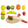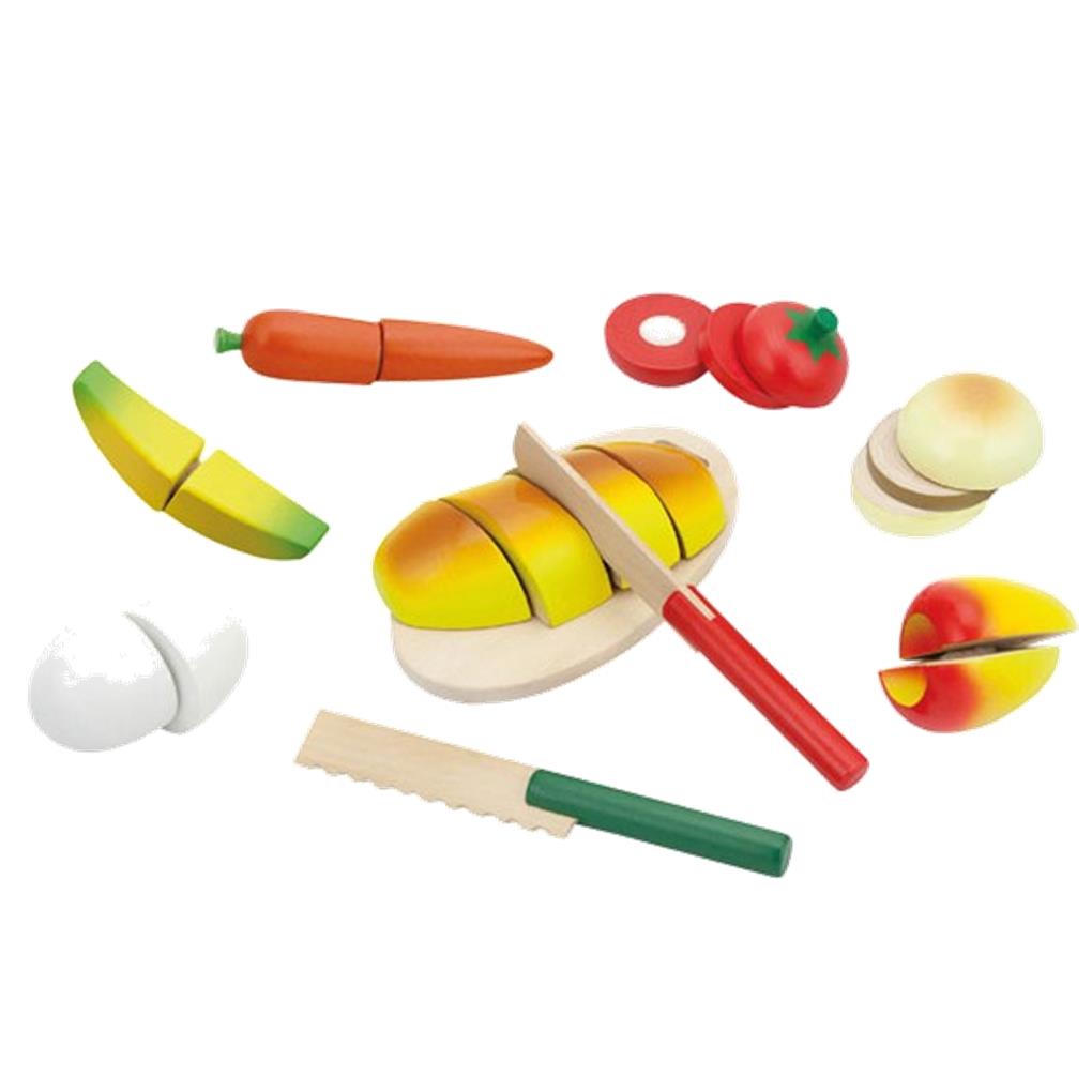 Contiene frutas, hortalizas, huevo, pan, etc., más una tabla de madera y 2 cuchillos para aprender a cortar.