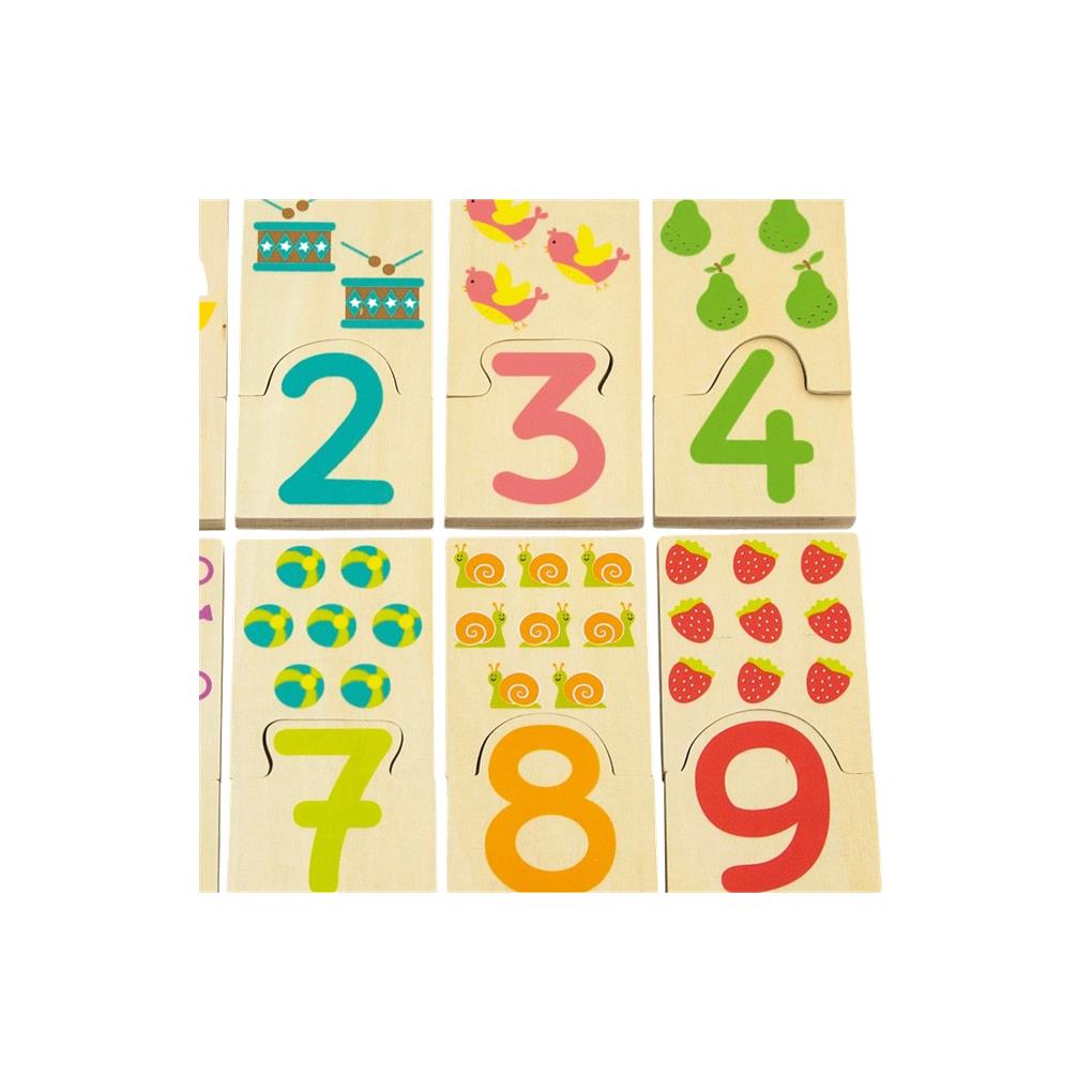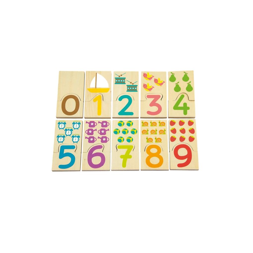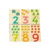 Fichas gigantes con los números del 0 al 9, cortados según su forma, para encajarlos. Medidas de la pieza: 12 x 6 x 0,9 cm.