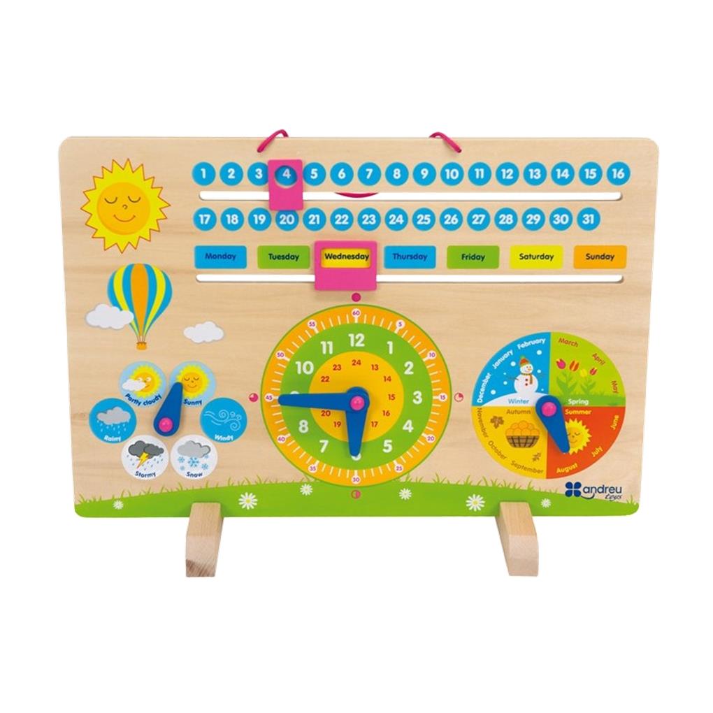 Calendario con soportes, para aprender y anotar las estaciones, los meses, los días de la semana, la hora y la meteorología de hoy. Versión en Inglés.Incluye soportes.