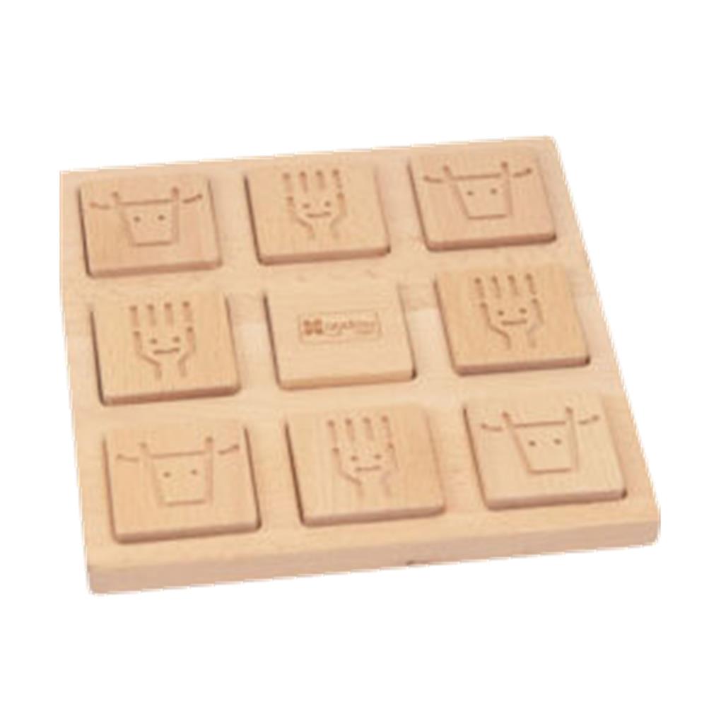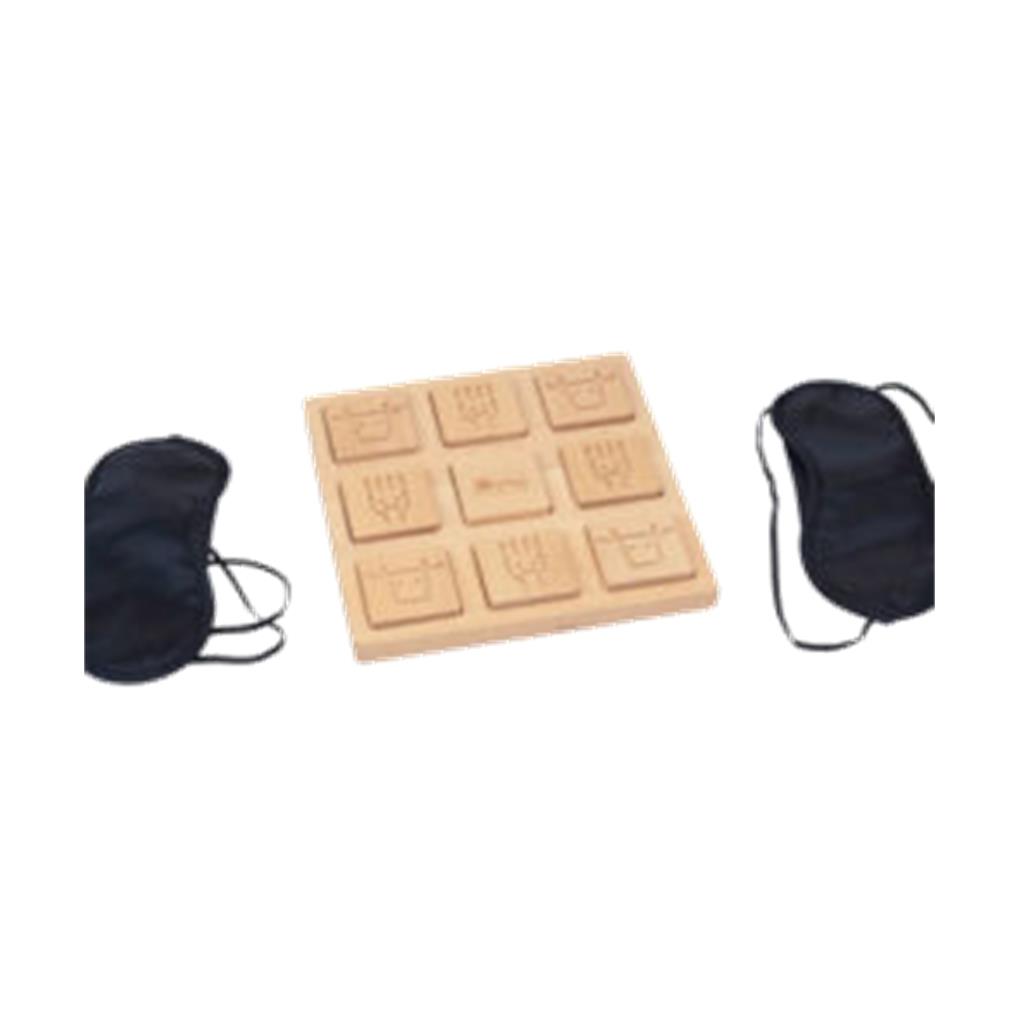 Juego del 3 en raya pero con motivos ancestrales grabados en las piezas, para una experiencia sensorial y para ejercitar la memoria. Incluye 2 antifaces, uno para cada juguador. Material didáctico idóneo para trabajar el reconocimiento táctil. También para niños o personas con algun tipo de diversidad funcional o para el colectivo de personas mayores. Incluye bolsa de tela. Tablero de 20 x 20 x 1 cm y 8 piezas grabadas de 4,9 x 4,9 x 1 cm.