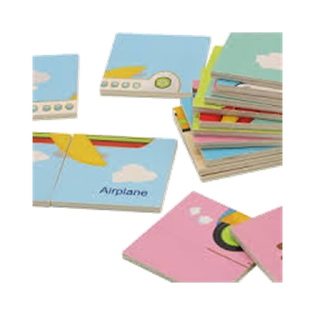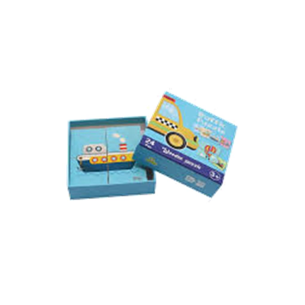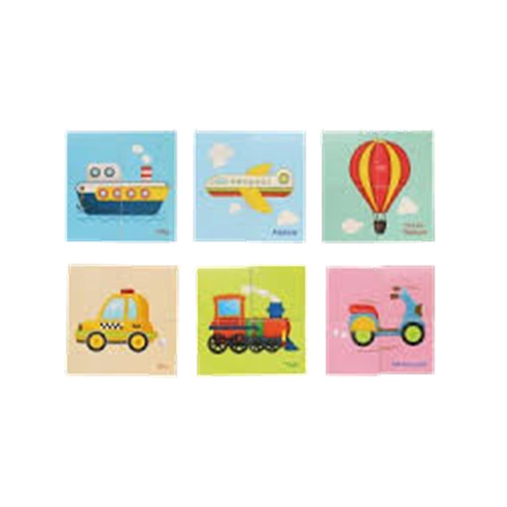 6 puzzles de madera con 4 piezas cada uno. Ilustraciones de vehículos de transporte.