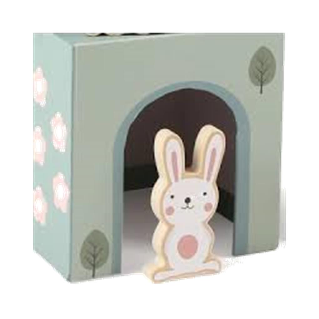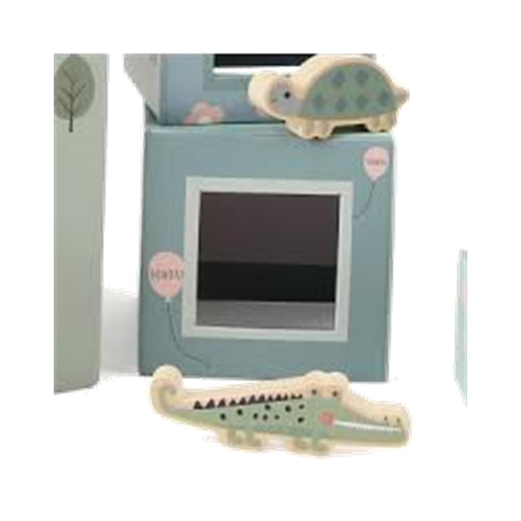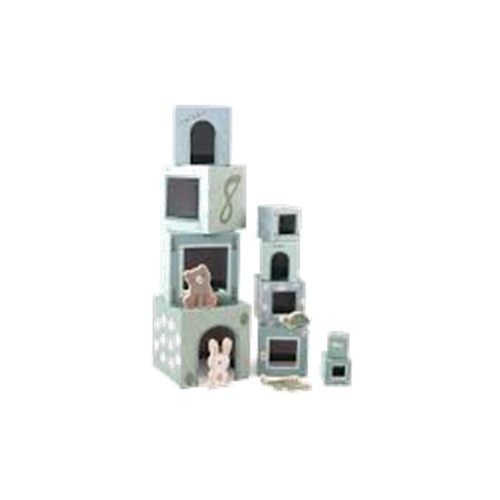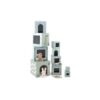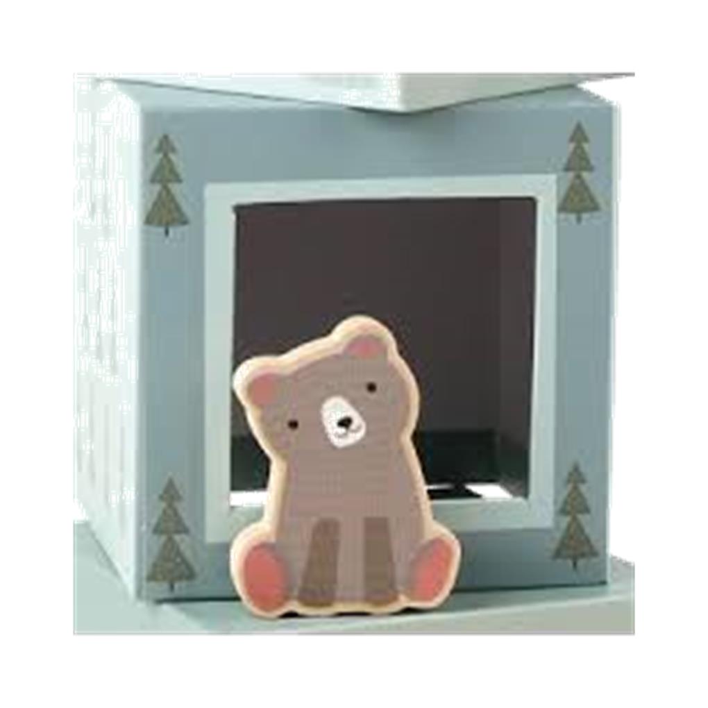 10 Cubos apilables de cartón + 4 animales de madera. Medidas de los animales: tortuga de 6 cm. osito de 7,5 cm. cocodrilo de 9 cm. conejo de 8,5 cm. Grosor piezas de: 1 cm. 10 cubos de 3,5 / 4,5 / 6 / 7 / 8 / 9 / 10 / 11,5 / 12,5 / 13,5 cm.