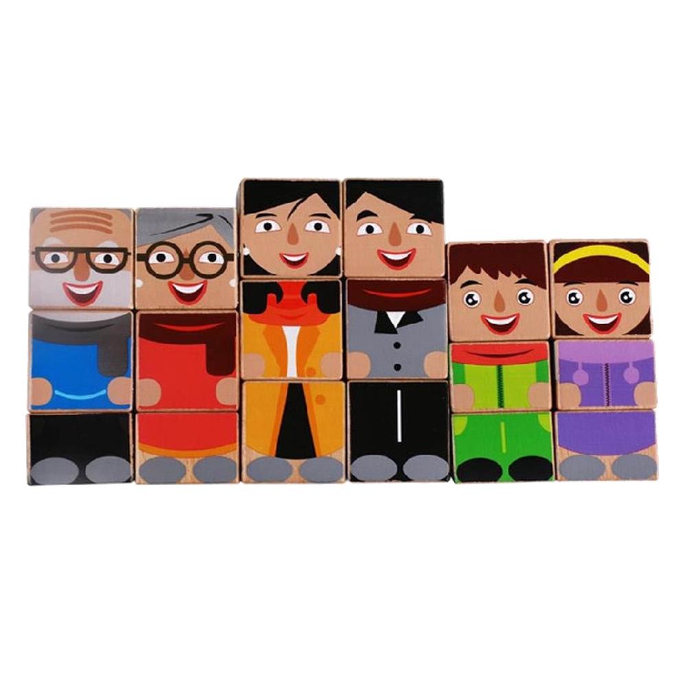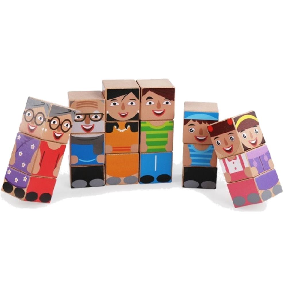 18 Cubos de madera para encajar mediante pivotes. Representan una familia con abuelos, padres y niños. Cada personaje dispone de 3 cubos pintados por 4 caras para crear un montón de combinaciones.