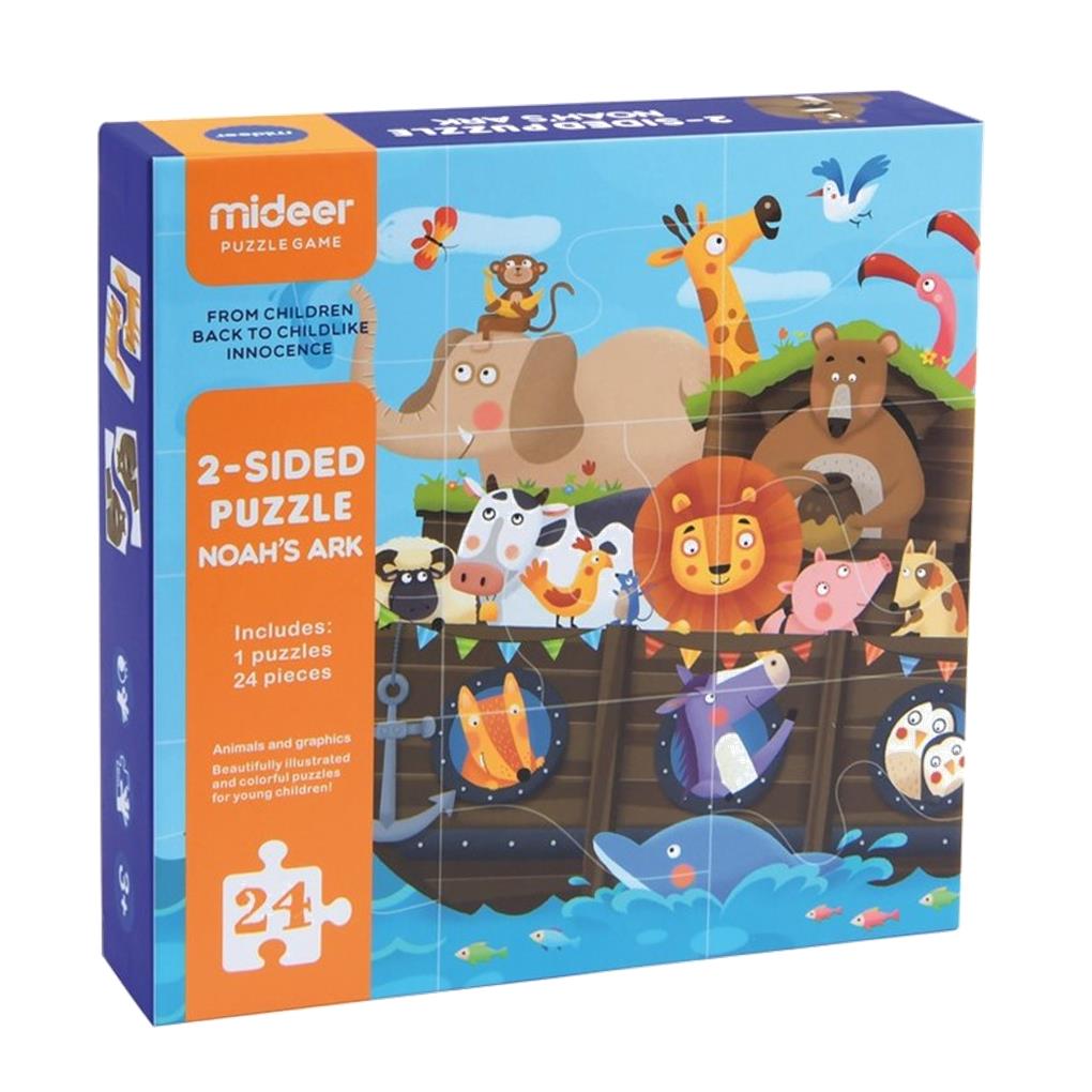 Puzzle de 24 piezas reversible. Monta el arca de noé o empareja los divertidos animales. Tamaño del puzzle montado: 40 x 30 cm.