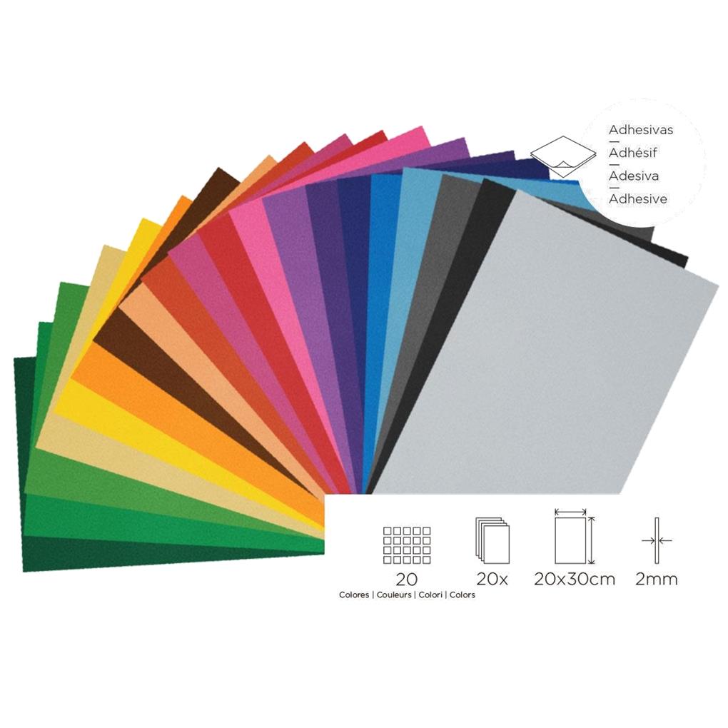 PACK 20 LÁMINAS GOMA EVA ADHESIVA COLORES SURTIDOS 20X30CMX2MM