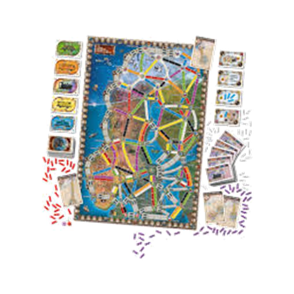 1 tablero de Europa del Norte, 200 Vagones de tren de colores, 114 cartas de Vagón, 55 cartas de Billete de Destino, 11 cartas de Objetivo común, 5 Marcadores de Puntuación, 1 Libro de reglas