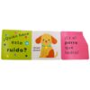 Un libro todo cartón, con solapas y sonidos en todas las páginas, y con un espejo como sorpresa final. Después de escuchar el sonido de