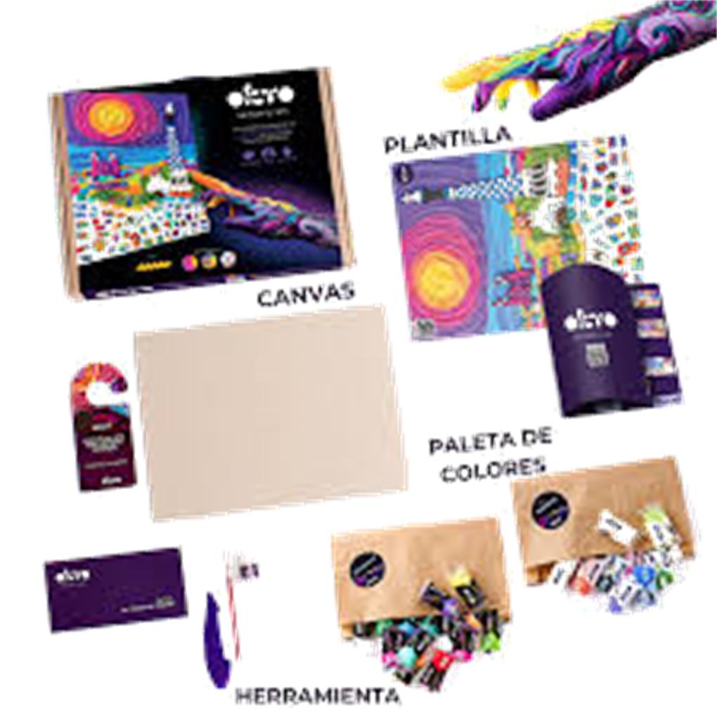 Incluye colores Air Clay, lienzo natural 30 x 40 cm, instrucciones paso a paso con imágenes y video-tutorial, herramientas para modelar, barniz acrílico 20 ml, pincel, accesorios experiencia sensory art & relax