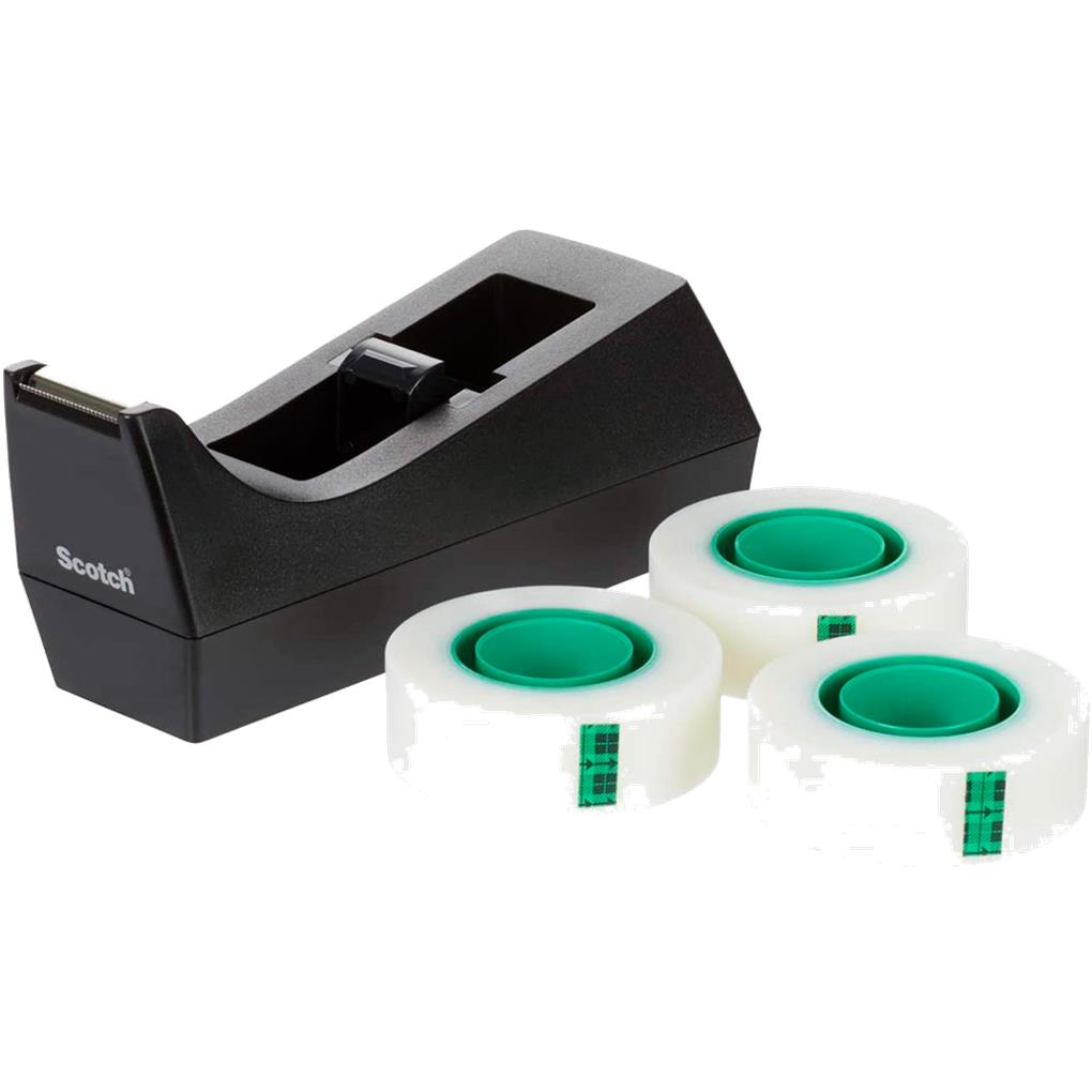 Portarollos negro fabricado en plástico 100% reciclado. Para cintas de hasta 33 m. Base antideslizante. Pack de portarrollos + 3 cintas scotch magic 900 de 33 m x 19 mm. Medidas: 69 x 165 x 69 mm.
