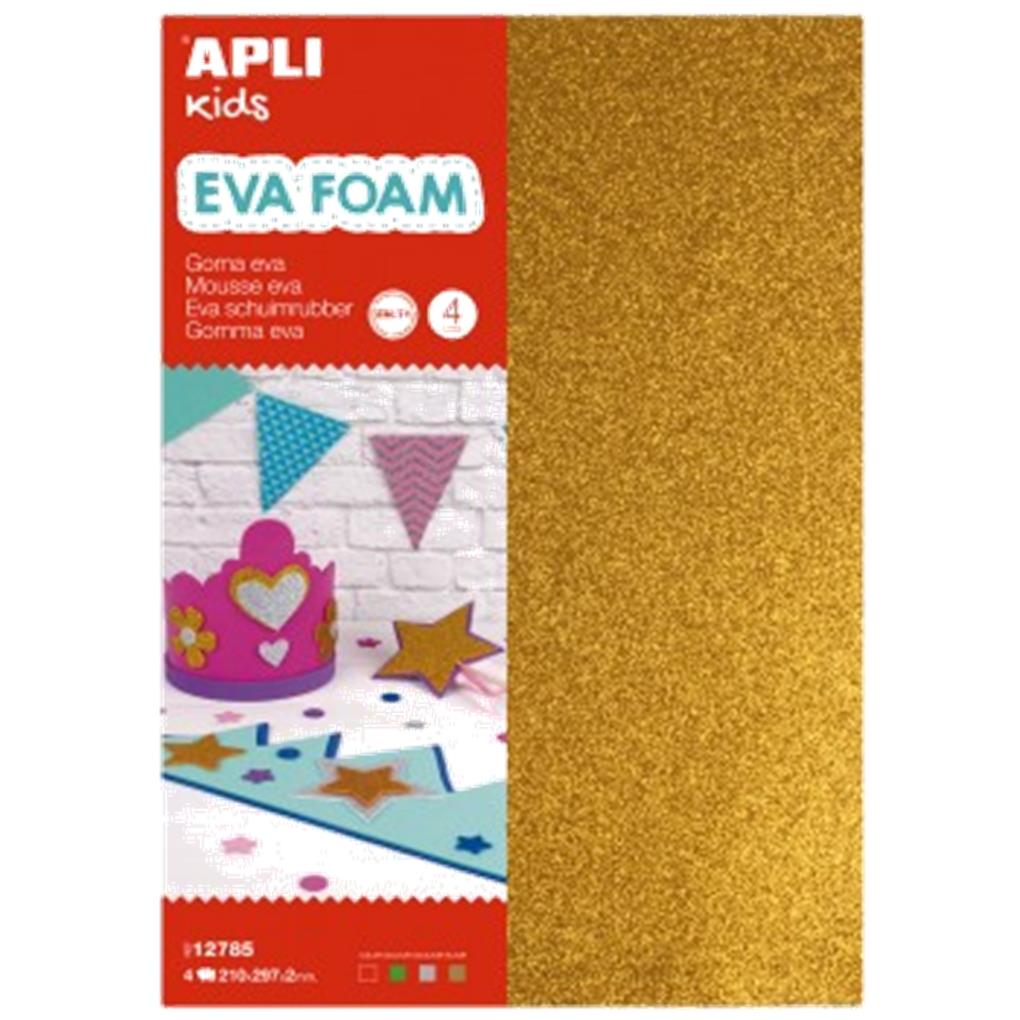 PACK GOMA EVA A4 PURPURINA PLATA, ORO, ROJO Y VERDE APLI