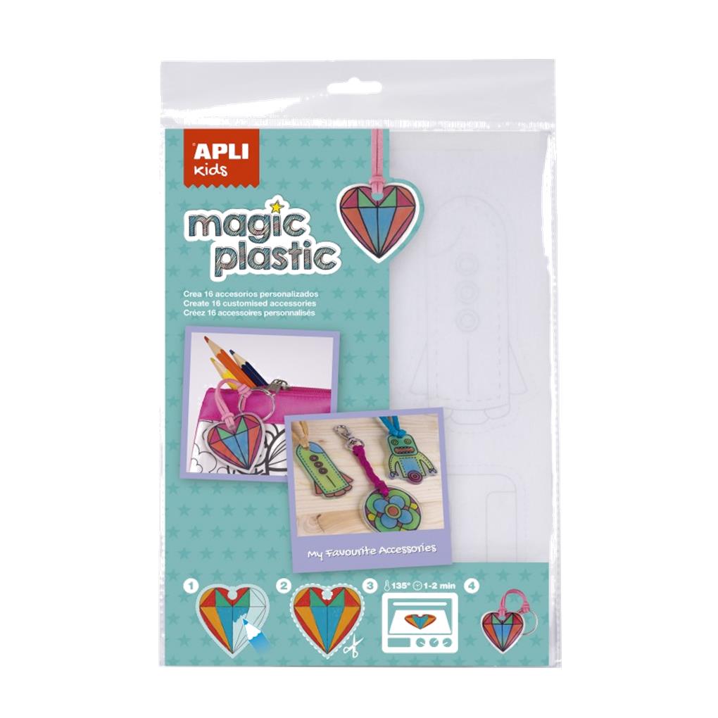 Papel de plástico mágico que, por arte de magia, reduce entre 3 y 4 veces su tamaño original y se transforma en plástico sólido después de unos minutos en el horno. Plástico mágico recomendado para colorear con lápices y rotuladores (para un mejor resultado se recomienda usar rotuladores permanentes). Pasarás de tener un dibujo plano a un objeto 3D. El pack contiene 4 hojas tamaño A4 de plástico mágico y 4 hojas con ejemplos para calcar. Ideal para crear colgantes, abalorios, insignias, llaveros… Recomendado para niños mayores de 6 años. Usar siempre bajo la supervisión de un adulto.