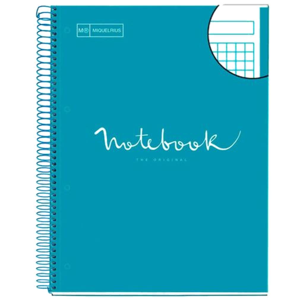 Cuaderno A4 Notebook 1 Cuadriculado Cuaderno de 80 hojas microperforadas con cuatro taladros y cuadrícula de 5 mm con encabezamiento y banda de color Cubiertas extra duras de cartón forrado de papel impreso y plastificado brillante en color azul Formentera Papel extra opaco de 90 gr/m²