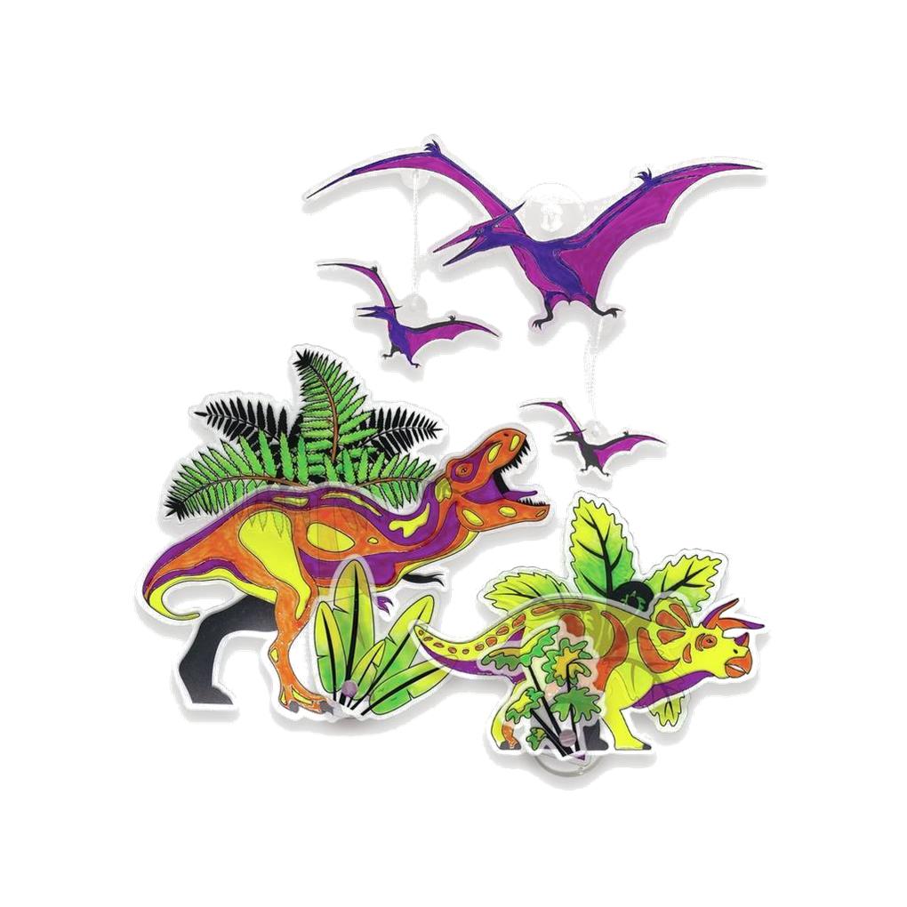 Crea 3 adhesivos para ventanas de dinosaurios. Pinta las piezas precortadas, adjuntalas a una ventosa y engánchalas a una ventana o a un espejo.