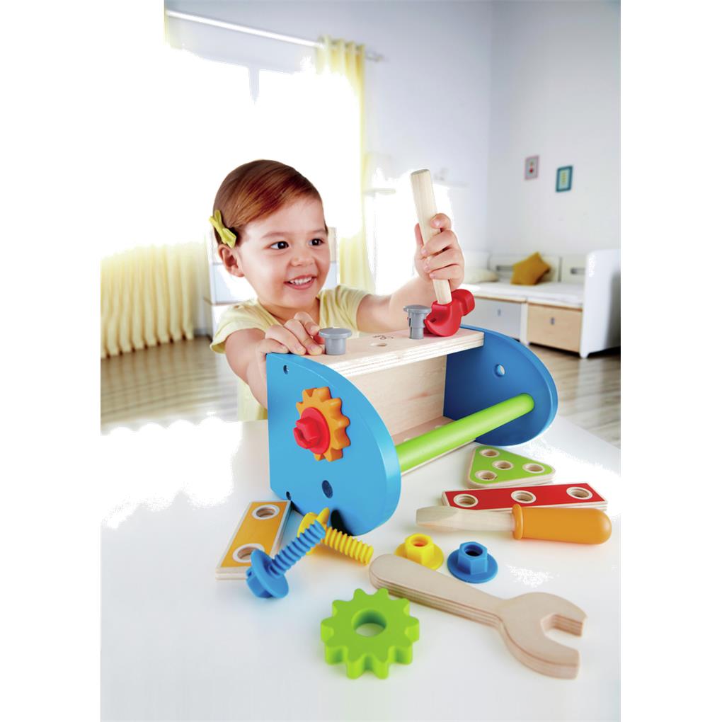 Tornillos, tuercas y todas las herramientas que necesita el pequeño constructor para su trabajo, vienen listos para usar en esta caja de herramientas.
