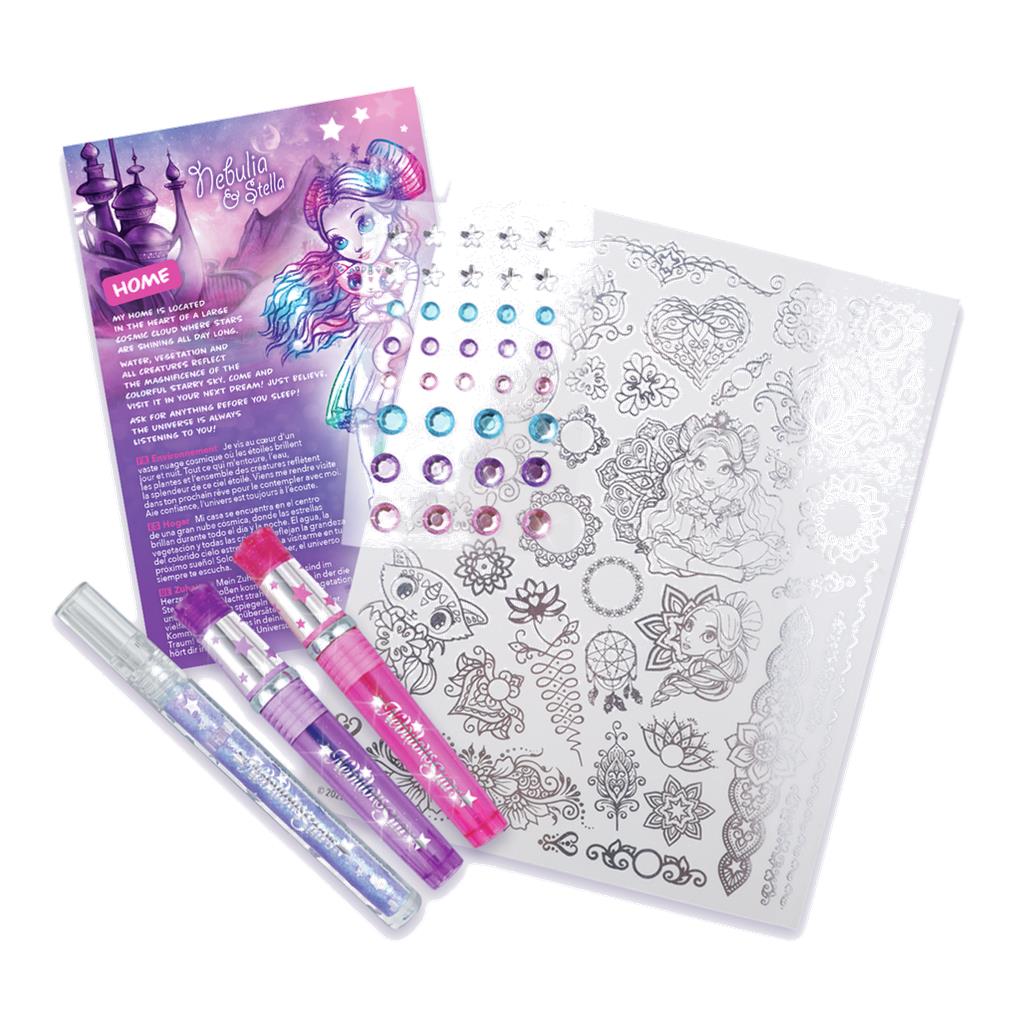 ¡Brilla como las estrellas! Un completo set de belleza para piel y uñas. 5 tipos de tatuajes temporales: color, metalizado, brillo en la oscuridad, sello y uñas.