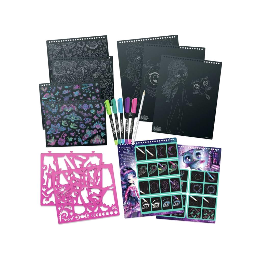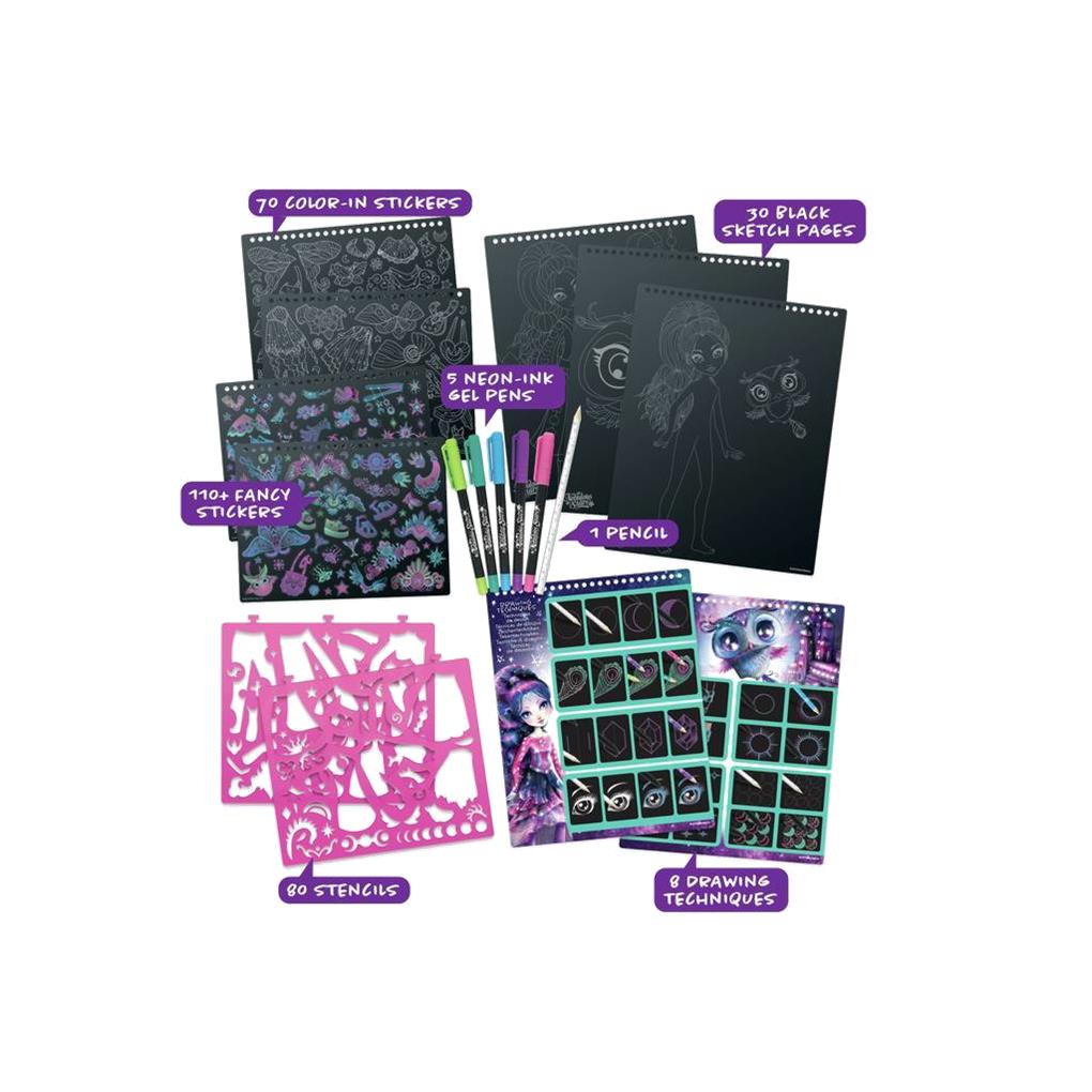Cuaderno de bocetos creativos de Eclipsia. ¡Las estrellas no pueden brillar sin oscuridad! Imagina la mejor experiencia creativa de moda con un toque de neón sobre papel negro. Descubre Eclipsia y su estilo repleto de estrellas a través de diversas actividades creativas.