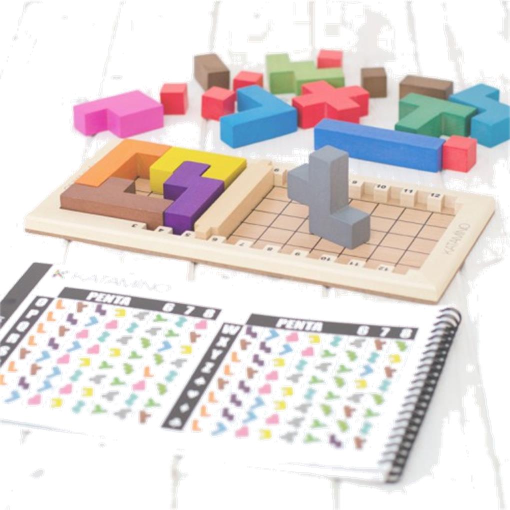 Adaptado a todas las edades, permite que los más jóvenes puedan entender la geometría espacial. Según la posición de la regleta, hay que realizar conjuntos perfectos combinando un determinado número de Pentaminos. Cuanto más aumenta este número, más se incrementa la dificultat. ¡Hay 36057 combinaciones!